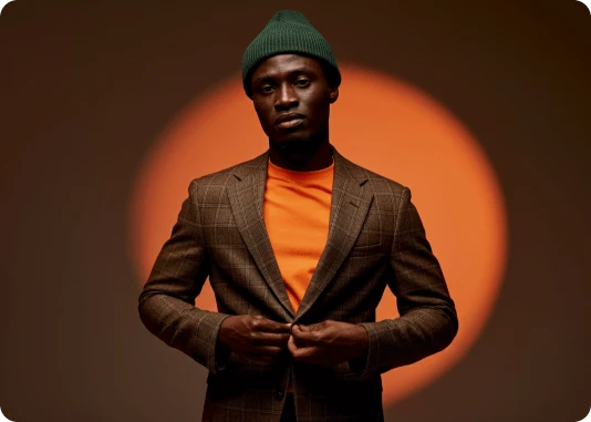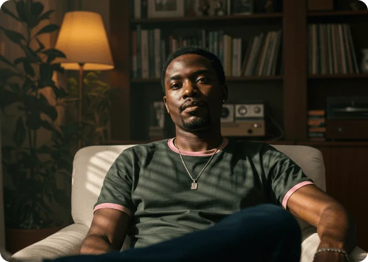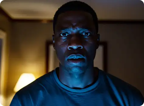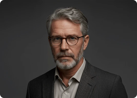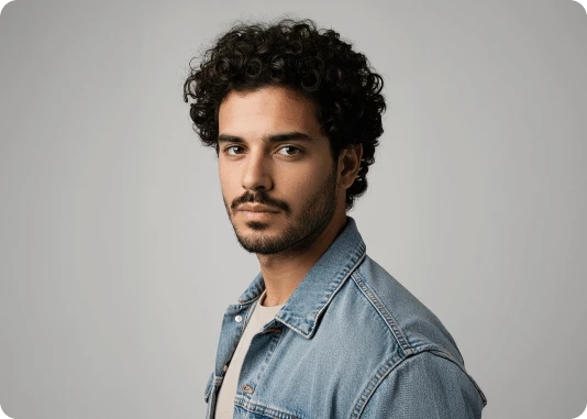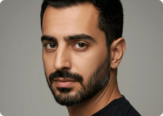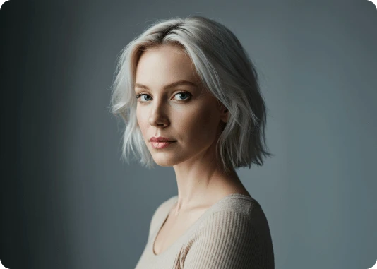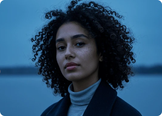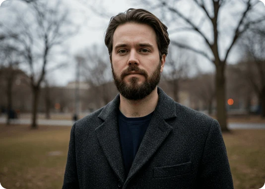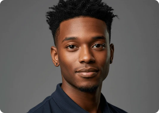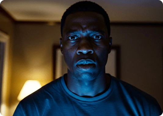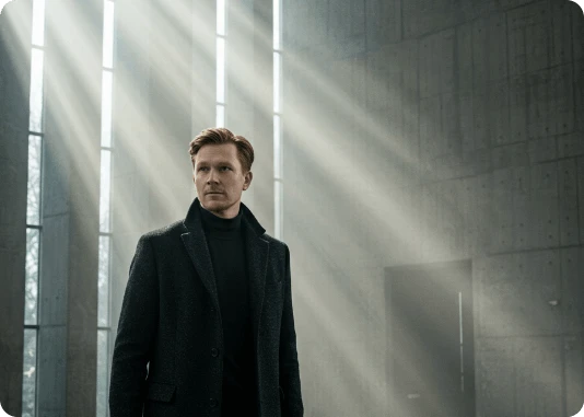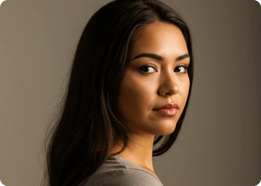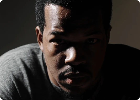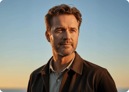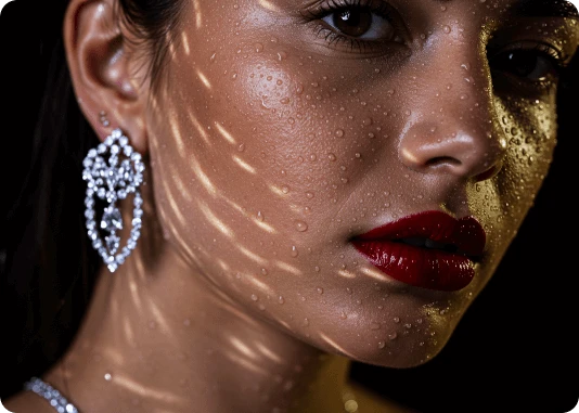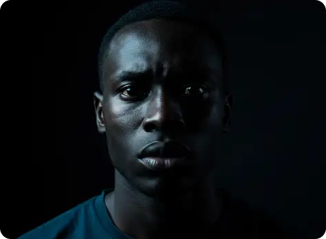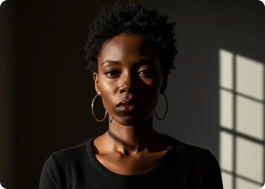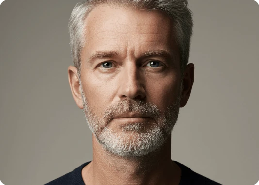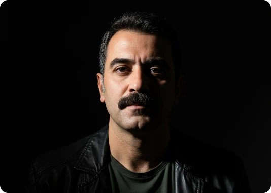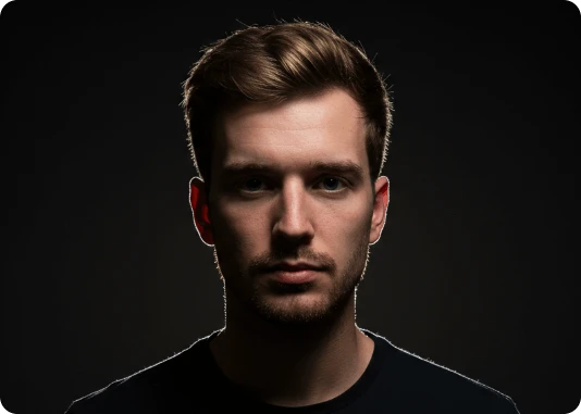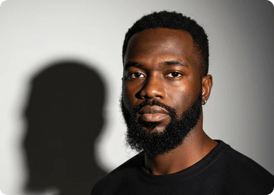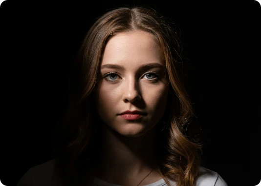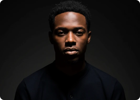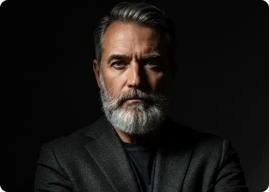 Por exemplo: ao invés de descrever a luz apenas com o termo top light, descreva assim: Lit with a single, centrally positioned top light, casting dramatic shadows under his eyebrows, nose, and chin. The focused top-down illumination sculpts his facial features with high contrast and depth.